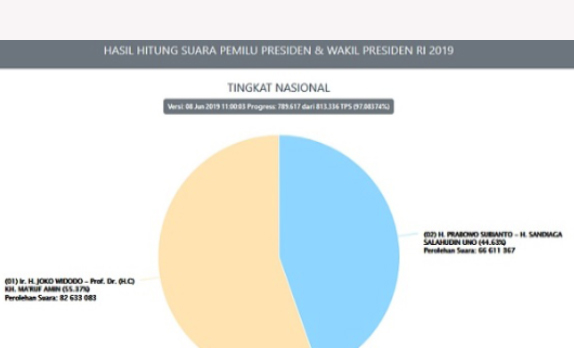 Memang, yang tertera di Situng KPU sesuai dengan penetapan yang diumukan pada 21 Mei lalu. Paslon Jokowi-Maruf terlihat unggul dengan perolehan suara yaitu 82.633.083 atau 55,73 persen.