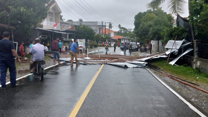 SEURAMOE BLANGPIDIE - Tiga atap Rumah Toko (Ruko) milik warga Gampong Kaye Aceh, Kecamatan Lembah Sabil, Kabupaten Aceh Barat Daya (Abdya) terbang dan dihempas dengan jarak mencapai 25 meter setelah diterjang badai.