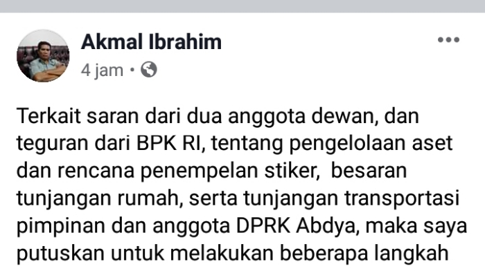 Dalam status yang di unggah itu, Bupati Abdya Akmal Ibrahim menulis tentang saran dua anggota dewan terkait pengelolaan aset daerah dan rencana pemasangan stiker pada mobil dinas, besaran tunjangan rumah dan transportasi anggota dan pimpinan dewan.