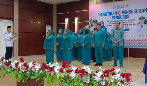 l Foto: IstBupati Aceh Jaya Safwandi melantik dan mengukuhkan Pengurus Tim Penggerak Pemberdayaan Kesejahteraan Keluarga (TP PKK), Pengurus Dewan Kerajinan Nasional Daerah (Dekranasda), serta Tim Kelompok Kerja (Pokja) Bunda PAUD Kabupaten Aceh Jaya masa bakti 2025-2030.
