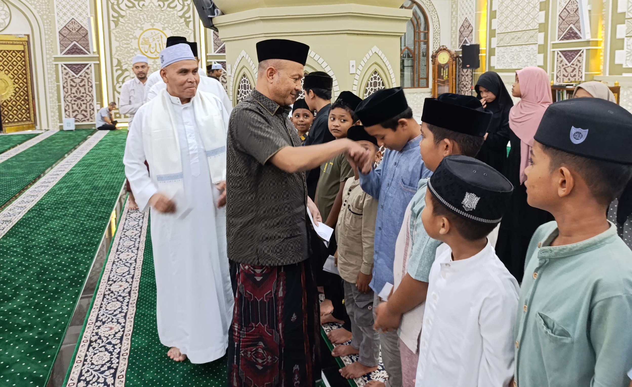 CALANG - Dalam rangka memperingati Nuzulul Qur’an 1446 H, Bupati Aceh Jaya, Safwandi, S.Sos., menyerahkan santunan kepada puluhan anak yatim di Masjid Agung Baitul Izzah, Minggu (16/3/2025)
