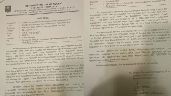 Berkaitan dengan hal tersbut dan sebagaimana arah pimpinan pada kesempatan terdahulu, Dirjen Bina Aparatur Kependudukan dan Pencatatan Sipil meminta untuk dapat dilakukan pemutusan jaringan komunikasi data kependudukan pada Disdukcapil Abdya. Begitu sekilas kutipan isi nota dinas yang dirangkum Seuramoeaceh.com.