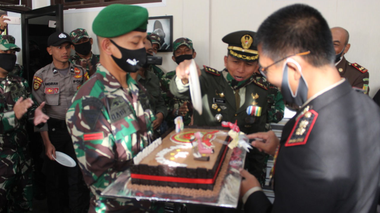 Ada pun momen haru, saat rombongan TNI membawa kue ulang tahun serta diiringi nyanyian selamat ulang tahun, setiba Kapolres memotong kue dan menyerahkan kepada Dandim suasana terlihat penuh kebersamaan.