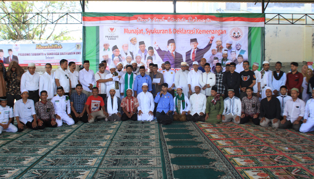 Ratusan tim relawan calon Presiden dan Wakil Presiden nomor urut 02 nampak khusuk serta larut dalam doa. Munajat itu langsung di pimpin oleh Tgk Tu Bulqani pengasuh Dayah Markaz Al-Ishlah Al-Aziziyah.