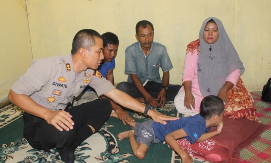 KAPOLRES Nagan Raya AKBP Giyarto SH S.IK, mengelus dengan penuh kasih sayang seorang anak penderita penyakit AFP (Akute Flaksit Paralisis), saat bekunjung ke rumah bocah itu untuk memberi bantuan dan memeriksa kesehatannya dalam rangka HUT Bhayangkara ke 73. |Foto: SEURAMOE/IST