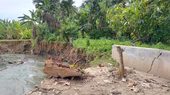 SEURAMOE BLANGPIDIE - Erosi krueng Susoh, Kecamatan Blangpidie Kabupaten Aceh Barat Daya (Abdya) kondisinya kian mengkhawatirkan, pasalnya tanah-tanah disepanjang aliran sungai sudah terkikis oleh air akibat cuaca hujan yang ekstrim akhir-akhir ini.