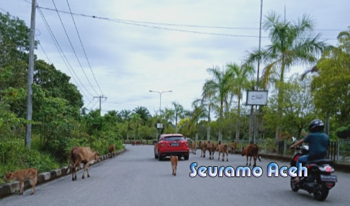 SEURAMOE SUKA MAKMUE – Bila memasuki Komplek Perkantoran Suka Maukmue Nagan Raya, agar hati-hati karena di jalan Poros Utama kawasan tersebut banyak sapi berkeliaran.