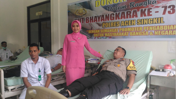 Kapolres Aceh Singkil, AKBP Andrianto Agramuda mengatakan 100 lebih personel mendonorkan darahnya untuk membantu pasien yang membutuhkan darah. Bakti kesehatan ini merupakan salah satu dari kegiatan menyambut HUT ke 73 Bhayangkara.
