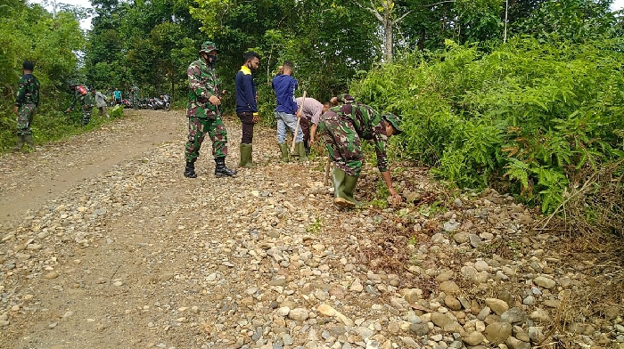 SEURAMOE BLANGPIDIE - Satuan Tugas (Satgas) TNI Manunggal Membangun Desa (TMMD) Ke-109 jajaran Kodim 0110/Aceh Barat Daya (Abdya) bersama dengan masyarakat di Desa Babah Lhueng, Kecamatan Blangpidie, kabupaten setempat melakukan gotong royong untuk merapikan badan jalan yang sudah dibangun sepanjang 2.500 meter.