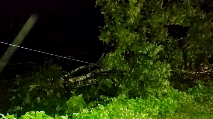 SEURAMOE BLANGPIDIE - Pohon rabutan di pinggir Jalan Nasional Gampong Kuta Makmur Kecamatan Jeumpa Kabupten Aceh Barat Daya (Abdya) tumbang diatas jaringan listrik yang mengakibatkan dua unit tiang listrik milik PLN tumbang kebadan jalan.