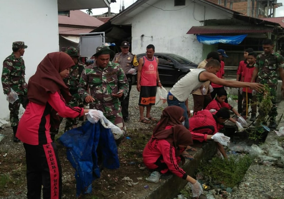SEURAMOE SUKA MAKMUE - Koramil 08/Kuala bersama sejumlah siswa Sekolah Menengah Pertama Negeri (SMP N) 2 Kuala melaksanakan kegiatan jumat bersih dikawasan komplek pasar inpres Desa Simpang Peut, Kecamatan Kuala, Nagan Raya. Jumat (15/11/2019)