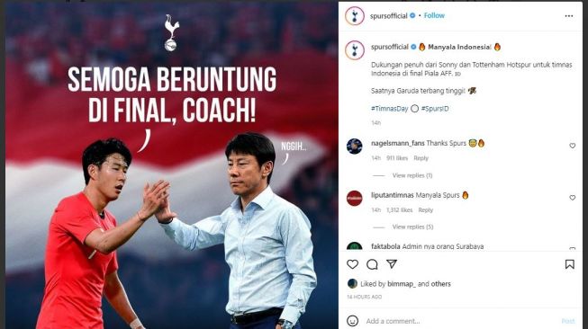 "Dukungan penuh dari Sonny dan Tottenham Hotspur untuk timnas Indonesia di final Piala AFF," tulis akun Instagram itu.