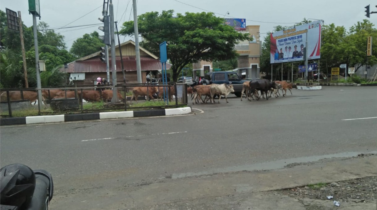 Senin (17/9/2018) puluhan lembu berkeliaran di Simpang masuk Pusat Perkantoran Suka Makmue dan cukup membahayakan pengendara di persimpangan tersebut.
