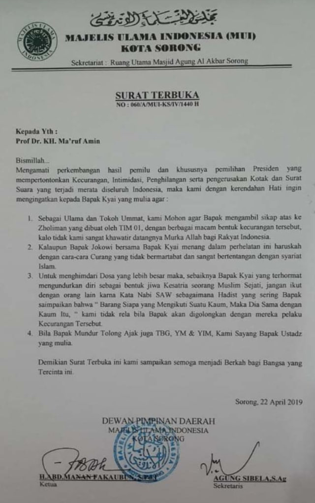 Ma’ruf Amin di Minta Mundur, Ini Isi Lengkap Surat Terbuka MUI Sorong