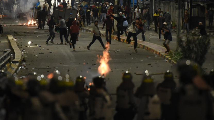 WIB, awalnya massa dan polisi sudah saling serang. Massa menggunakan bom