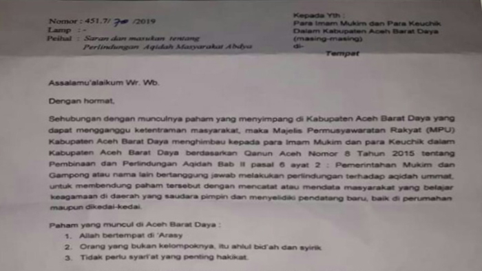 Surat yang ditanda tangani oleh Ketua MPU Abdya, Tgk