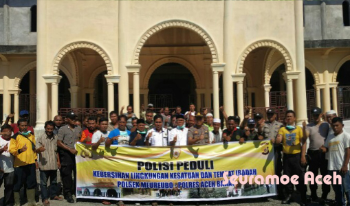 Camat, Danramil dan Kapolsek Meuruboe hadir dan ikut bersama warga menyemprot cairan tersebut dan membersihkan Masjid. (*)
