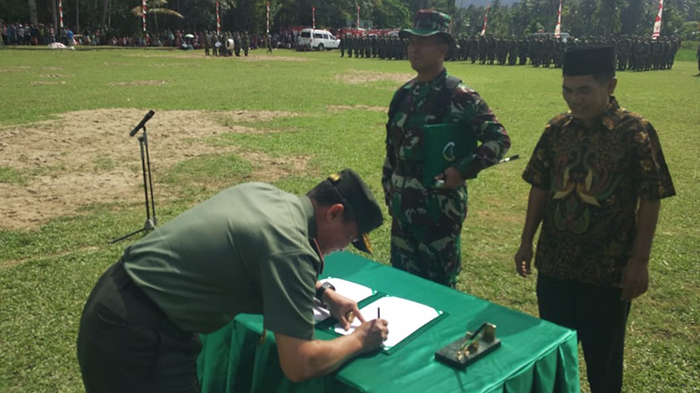SEURAMOE BLANGPIDIE – Pangdam Iskandar Muda (IM) Mayjen TNI Teguh Arief Indratmoko menutup kegiatan TNI Manunggal Membangun Desa (TMMD) reguler 104 Kodim 0110/Abdya yang diselenggarakan di Gampong Adan, Kecamatan Tangan - Tangan, Kabupaten Aceh Barat Daya. Rabu (27/3/2019).