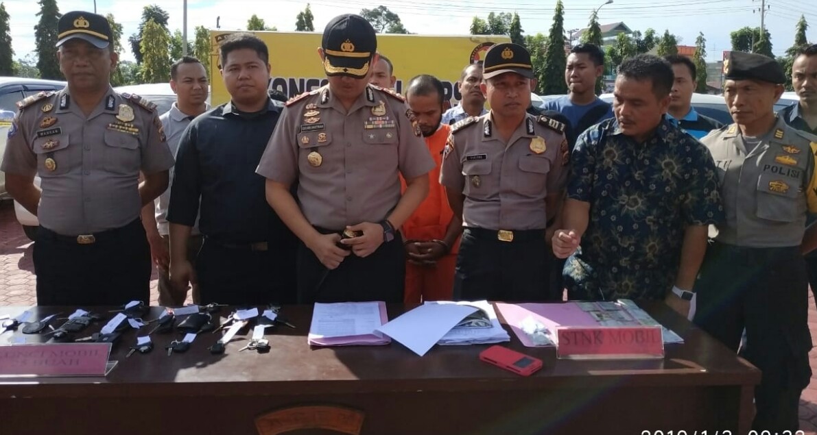 SEURAMOE KUALA SIMPANG - Satuan Reskrim Polres Aceh Tamiang, berhasil mengungkap dugaan penggelapan 25 unit mobil rental dan menangkap pelakunya.
