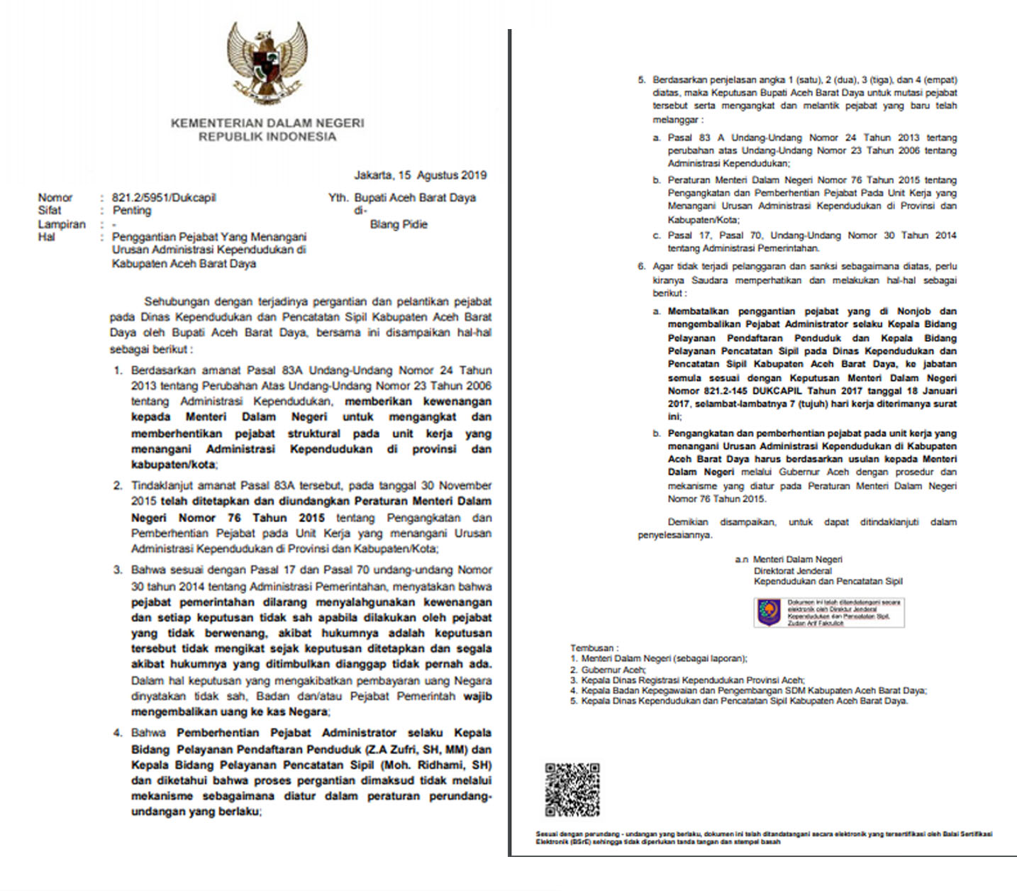 Kependudukan Pencatan Sipil memuat beberapa aturan yang dilanggar oleh Bupati