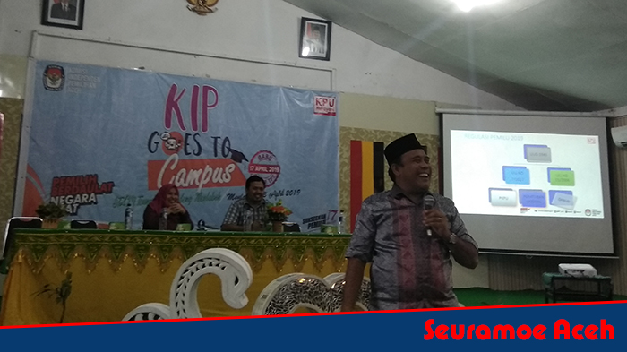 SEURAMOE MEULABOH - Komisi Independen Pemilihan (KIP) melakukan sosialisasi pendidikan pemilih pemula, dalam rangka Goes To Campus STAIN Teungku Dirundeng Meulaboh, Sabtu (13/04/2019) kegiatan tersebut berlangsung di aula kampus setempat.
