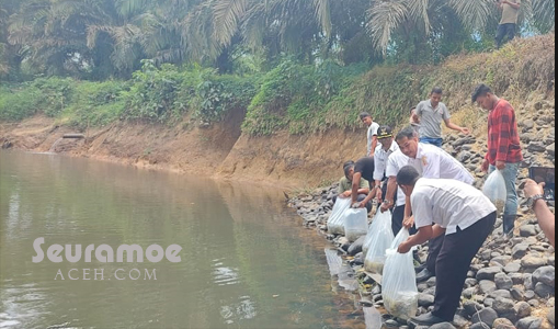 SEURAMOEAceh.com l Peringati Hari Lingkungan Hidup (HLH) Sedunia 2024, PT Beurata Subur Persada (BSP) Babah Dua Kecamatan Tadu Raya Nagan Raya, Rabu (12/06/2024) melepas ribuan bibit ikan ke sungai Krueng Trang dan membagikan bibit tanaman produktif kepada warga sekitar.