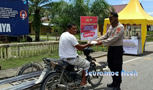 SEURAMOE SUKA MAKMUE - Personel Polres Nagan Raya bersama Polsek Kuala dan personel Koramil 08 Kuala membagian 125 nasi kotak gratis kepada pengguna Senin, (13/04/20)