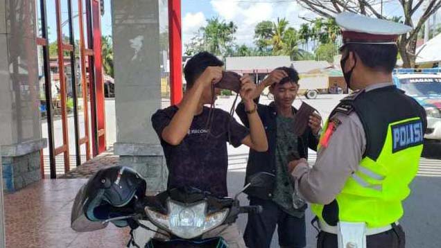 TribatanewsSEURAMOE SUKA MAKMUE – Personel Satlantas Polres Nagan Raya bagikan masker guna mencegah penularan virus corona kepada warga Ujong Patihah, Kecamatan Kuala, Jumat (15/5/2020).