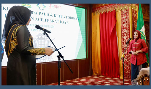 l Foto: IstBLANGPIDIE - Bunda PAUD Aceh Marlina Muzakir, Kamis 17 Juli 2023 mengukuhkan Ratna Sari Dewi sebagai Bunda PAUD dan Forikan Aceh Barat Daya (Abdya) Periode 2025-2030.