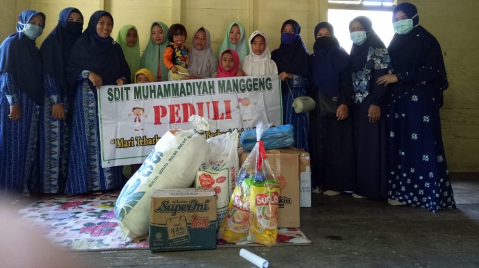 SEURAMOE BLANGPIDIE - Sekolah Dasar Islam Terpadu (SDIT) Muhammadiyah Manggeng Kecamatan Manggeng Kabupten Aceh Barat Daya (Abdya) menyantuni Keluarga Fatimah yang baru saja memeluk agama Islam.