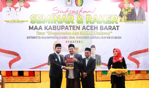 l Foto: IstMEULABOH - Majelis Adat Aceh (MAA) Kabupaten Aceh Barat menggelar Seminar Menyelaraskan Adat Mahar (Jeulame) dengan Syariat Islam sekaligus Rapat Kerja MAA Tahun 2025 di Aula T. Umar Bappeda, Senin (10/11/2025).