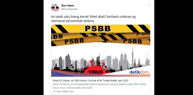 Twet Adamsyah Wahab mentautkan link pemberitaan media berjudul "Riset LSI Denny JA: 99% Kasus Corona di RI Tuntas Bulan Juni 2020" yang dipublish Rabu 29 April 2020.