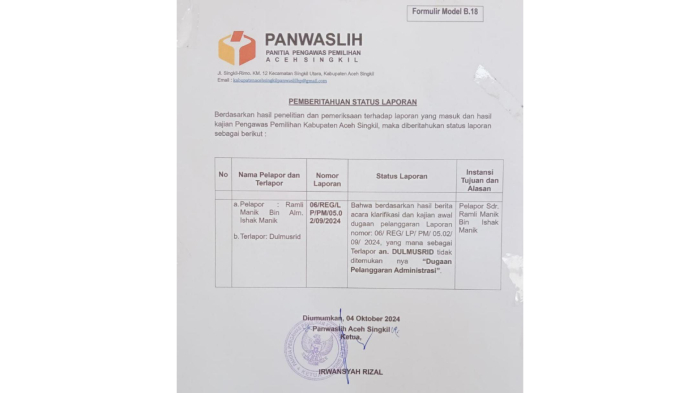 "Pemeriksaan dan kajian awal yang dilakukan oleh Panwaslih terhadap laporan dengan nomor 06/REG/LP/PM/05.02/09/2024 tidak menemukan bukti adanya pelanggaran administrasi yang dilaporkan," kata Ketua Panwaslih Aceh Singkil, Irwansyah Rizal, kepada Seuramoeaceh.com, Minggu (6/10/2024)
