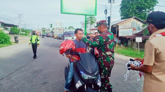 SEURAMOE | JULIDA FISMASEURAMOE BLANGPIDIE - Menjelang berbuka puasa Tim Gugus Tugas Percepatan Penaganan Covid-19 Abdya, membagikan ribuan masker dan takjil kepada pengguna jalan raya. Senin (11/5/2020).
